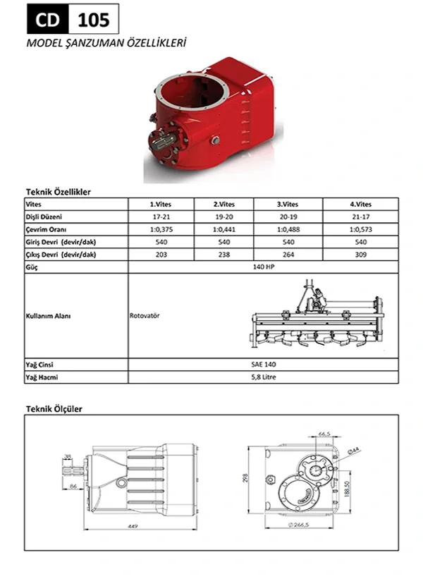 Önemli Not: CD 105 Rotovatör Şanzımanı, sağlam yapısı ve yüksek güç aktarma kapasitesi ile profesyonel kullanıma yöneliktir. Giriş devri, traktör PTO devri olan 540 devir/dak olarak kabul edilmiştir.