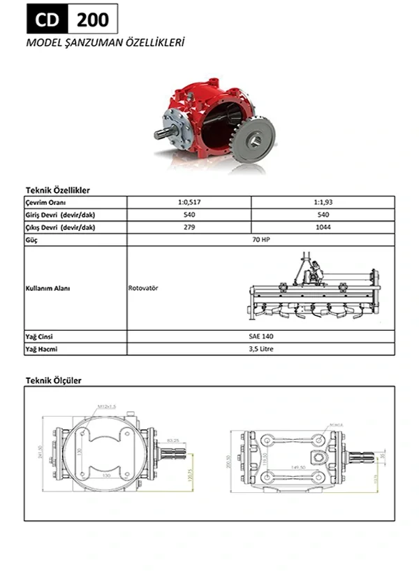 CD 200 rotovatör şanzımanının çevrim oranları, çıkış devirleri ve 70 HP güç kapasitesi bilgileri aşağıdadır.