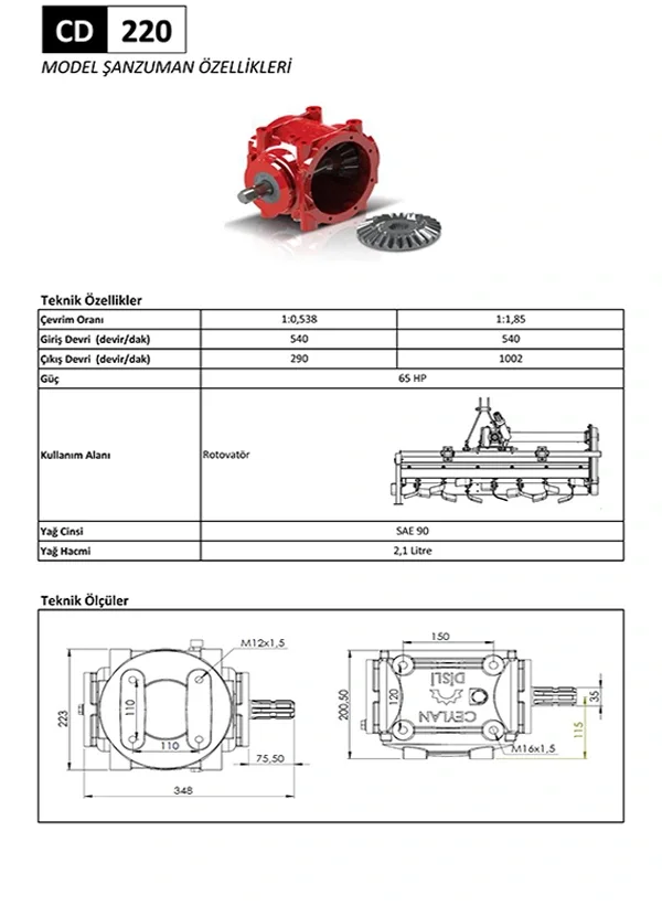 CD 220 rotovatör şanzımanının çevrim oranları, çıkış devirleri ve 65 HP güç kapasitesi bilgileri aşağıdadır.