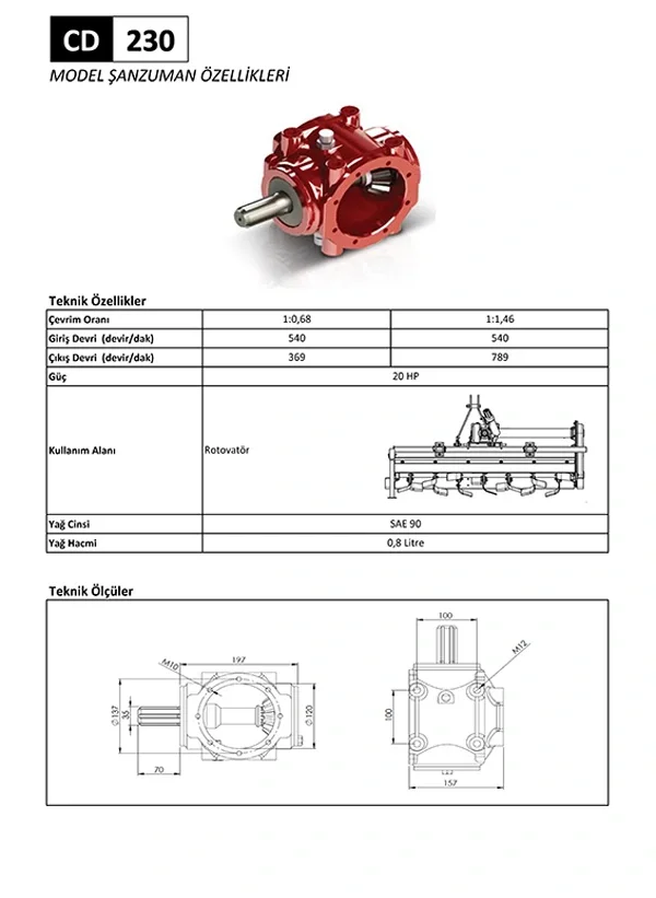 CD 230 serisi rotovatör şanzımanı, özellikle mini, bahçe ve küçük çaplı traktörler için tasarlanmış, **20 HP** (Beygir Gücü) maksimum kapasiteli kompakt bir modeldir. Çift hız seçeneği ile bu küçük şanzıman, farklı işleme ihtiyaçları için esneklik sunar.