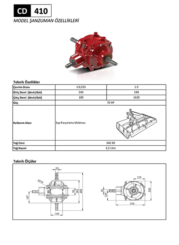 CD 410 serisi şanzıman, maksimum **70 HP** (Beygir Gücü) kapasiteli traktörler için tasarlanmıştır ve temel kullanım amacı **Sap Parçalama Makineleri**dir. Şanzımanın çift çevrim oranı, makinenin farklı parçalama ve temizleme modlarında esnek çalışmasını sağlar.