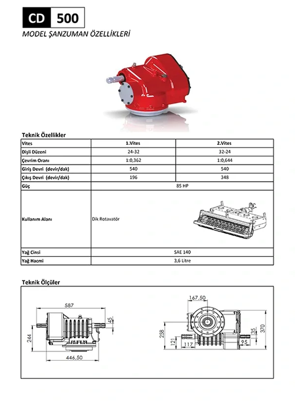 CD 500 serisi şanzıman, özellikle **Dik Rotovatörler** (Vertical Tiller) için tasarlanmıştır ve maksimum **85 HP** (Beygir Gücü) kapasiteli traktörlere uygundur. Dik rotovatörler, yüksek dikey bıçak dönme gücü gerektirir ve bu şanzıman çift hız seçeneği ile bu ihtiyacı karşılar.