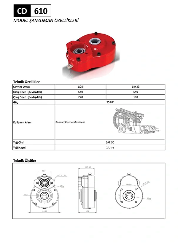 CD 610 serisi şanzıman, maksimum **35 HP** (Beygir Gücü) kapasiteli traktörler için tasarlanmıştır ve özellikle **Pancar Sökme Makineleri**nin titreşimli ve söküm üniteleri için iki farklı stabilize çıkış hızı sunar.